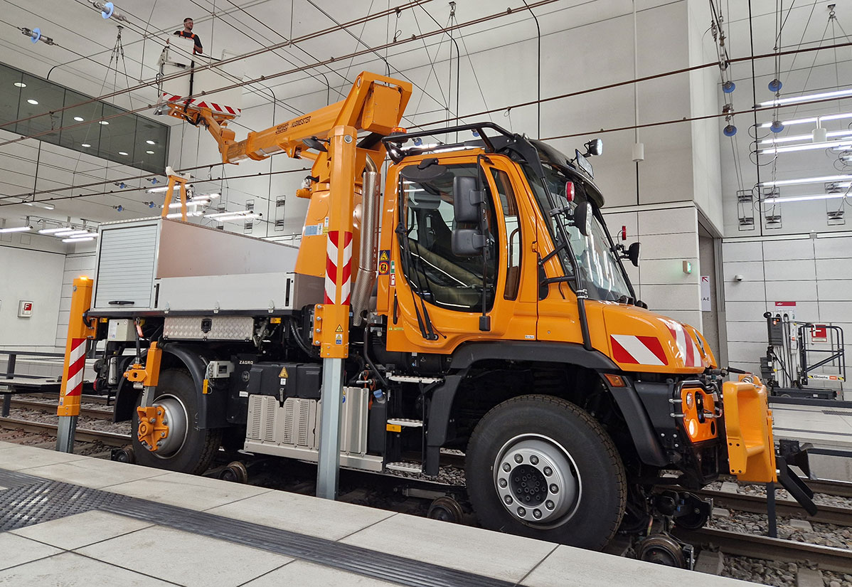The work vehicles were equipped with various attachments for a wide range of tasks, from green space maintenance to de-icing. The equipment includes an extendable telescopic mast lifting platform for maintenance work, a loading crane for flexible material transport, a track sprayer for vegetation control and winter service, and a front boom with mowing head or brush cutter for trimming the profile on both sides of the track. With a de-icing system and a snow plough for winter service and snow clearance, the road-rail vehicles are ideally equipped for multifunctional use on the track system.